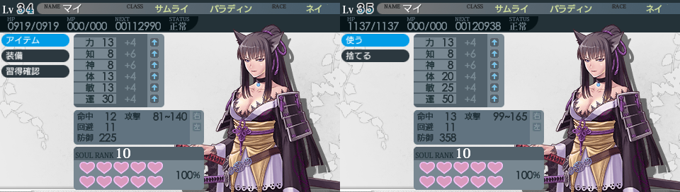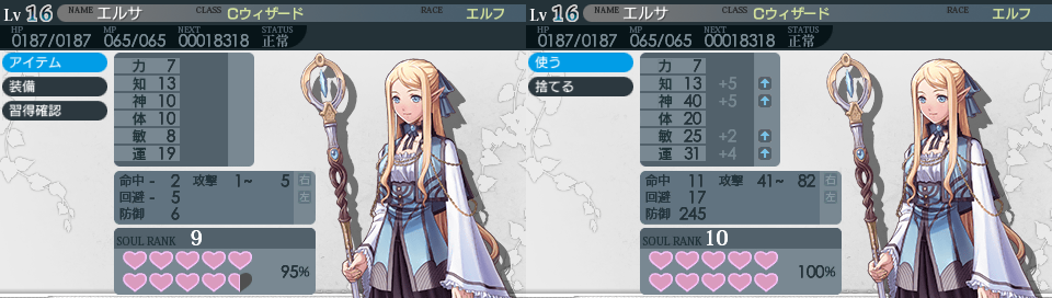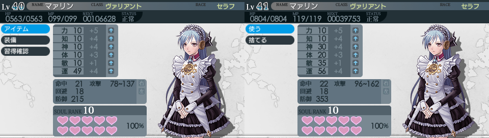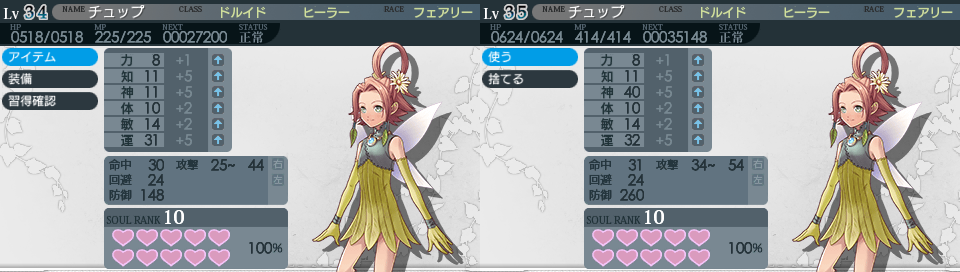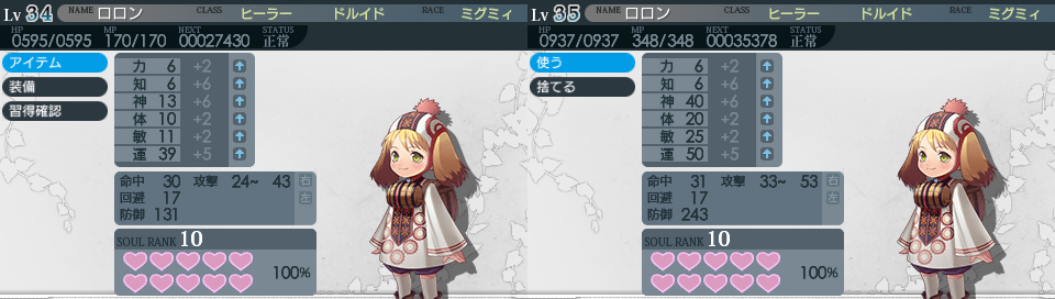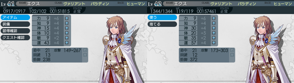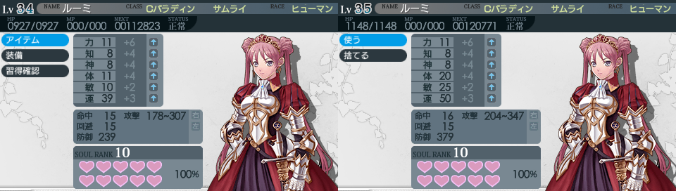 死闘場攻略前に、ドルイド2名がLv34になるまでレベリング。 竜巻狩りでステータスのドーピングを行う。 今回は死闘場を利用し、アルダフォアグラ撒く。 ドラントゥースは後程大量に使用するので、手に入れたら溶かさずにストック。 キリが無いので各キャラ40~50ポイント程ドーピングしたところで終了。 ロロンとチュップに神を先行して振り、1LV上げてMP増加とマナ回復IIの習得を挟んでいる。 竜巻狩りを終えたらチュップの任務は完了となり、長らく待機していたエルサリアと交代。 続いてサブクラス設定。 各キャラ侍Lv1経由でドラントゥースを2本持たせ、パラディンを設定していく。 先生も合わせて再設定。 ドラントゥースの通常攻撃はまともにダメージが通らない為、 敵は防御無視の突撃ユニオンで処理する事となる。 命中が足りないうちは罠系ユニオンやヒットスローを併用。 ・ベヒモス という訳で、長らくお世話になった死闘場を閉鎖。 鏡の破片を全て集めたら、次はいよいよラストダンジョン冥府の城へ突入。 ・キスキルリラ 突撃処理。 門番を処理したら刀狩りの開始。 まずは冥府1Fで霜降りステーキを撒き、多少レベリング。 ヴァルキリアスを2本回収したら、ルミーナのサブをウィザードに変更。 ある程度余裕が出てきたら3F神暦納豆に切り替える。 1Fでも出ないことは無いが、村正系のドロップ率は3Fの方が高い模様。 ・スケア=エラステ、スケア=ピロス、スケア=オーマ 途中、何かいたので適当に突撃で処理。 ・ルキフェル ついでにこちらも処理。 ちなみに低いレベル帯で挑戦する場合、7ターン目までにいかにしてキスキルリラを叩くかが勝負となる。 7ターン目の常駐消去はルキフェルとキスキルリラの同時使用なので、 重ねがけ不可のフォースガードで防ぐのは事実上不可能。 ラストデザイア未習得のレベルでは速攻するしかない。 追加のヴァルキリアスを手に入れたので、神の超技を取りに神の座へ。 ・オブリス(2) 全員パラディンならグランドクロスも気にする必要が無く、雑魚敵と同じ感覚で処理が可能。 ルキフェル戦と異なり常駐消去は単発使用なので、 フォースガードさえ維持すればバフデバフがいくらでも詰める。 よって低いレベル帯で攻略する場合、自動回復に対する火力の確保が課題となる。 編成にもよるが、概ね修羅が一番手軽か。 ちなみに神の座でドロップする「神の○○」シリーズは、売却不可なので補正の変更が効かない。 とは言え補正幅が非常に大きいので、下手に吟味を始めると大変な目に合う。 竜巻狩りでドーピングする方が圧倒的に早いので、吟味するにしても適当なところでの妥協が肝心。 神の座が終わったら再び冥府へ。 神村正ドロップ。 リスト順が一番下で不便。 村正、大村正ドロップ。 全員運極でステータスを振っているせいか、さほど苦労せず入手できた。 以下最終編成。 PR |